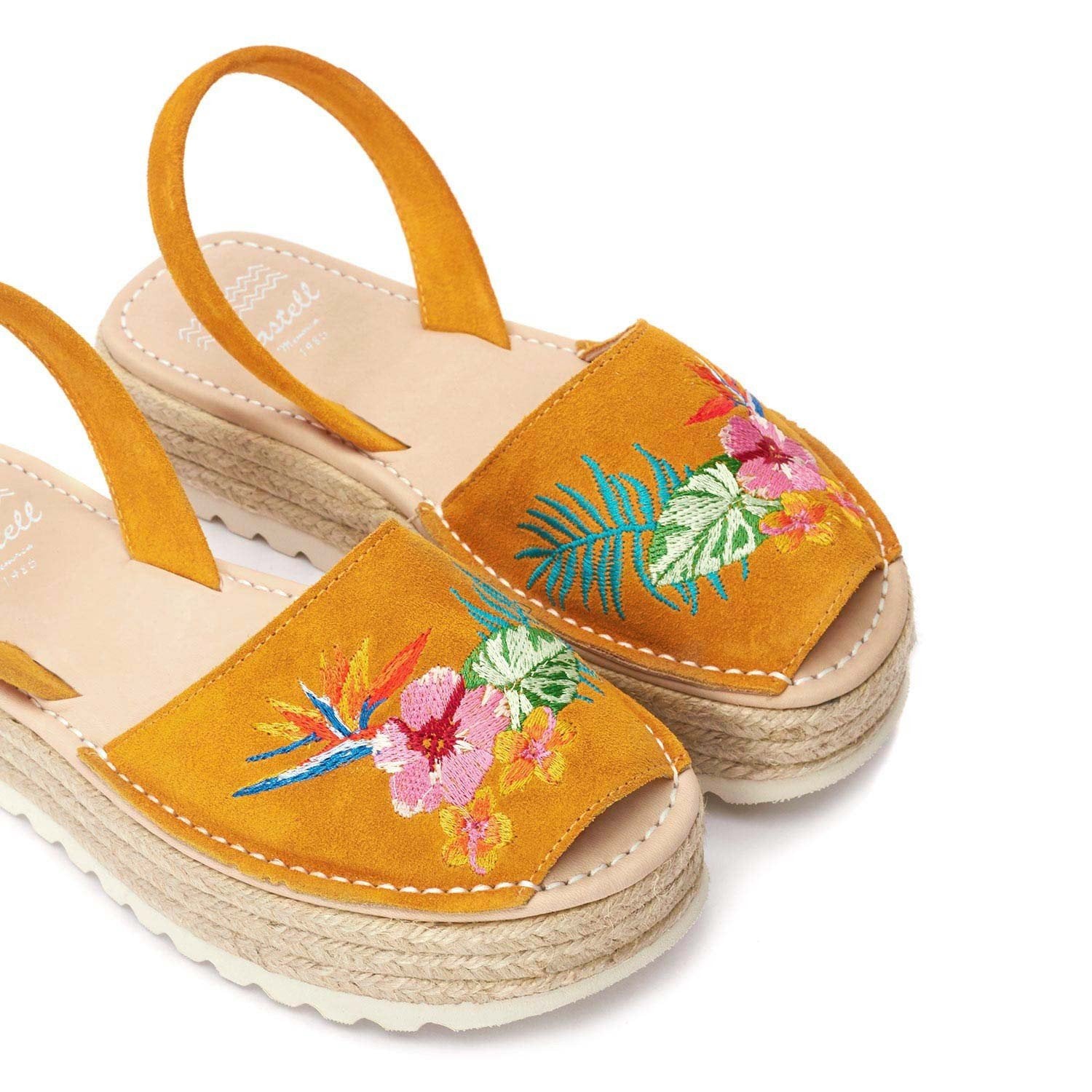 Summery and elegant in style. Enjoy summer with these casual chic safran platform Avarcas with beautiful handstand flower embroidery.