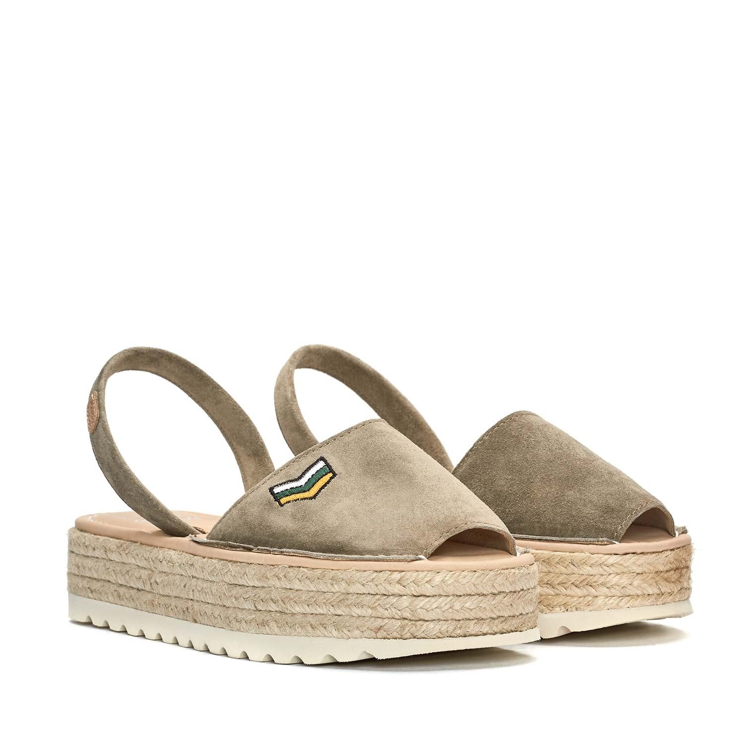 This handmade Avarca has everyday 'street' quality. Sandy grey in colour, featuring a military inspired embroidery - they look great with denim.